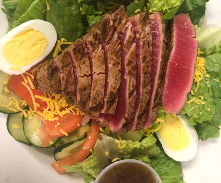 All salads served with 6 oz. portion of protein on a bed of romaine lettuce, tomatoes, cucumbers, and a boiled egg topped with freshly grated cheddar cheese.